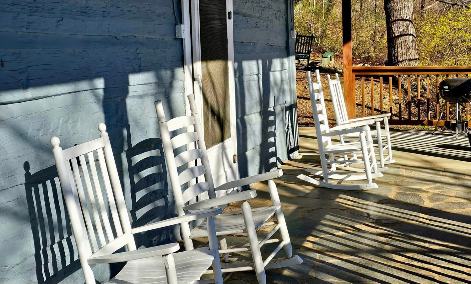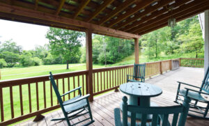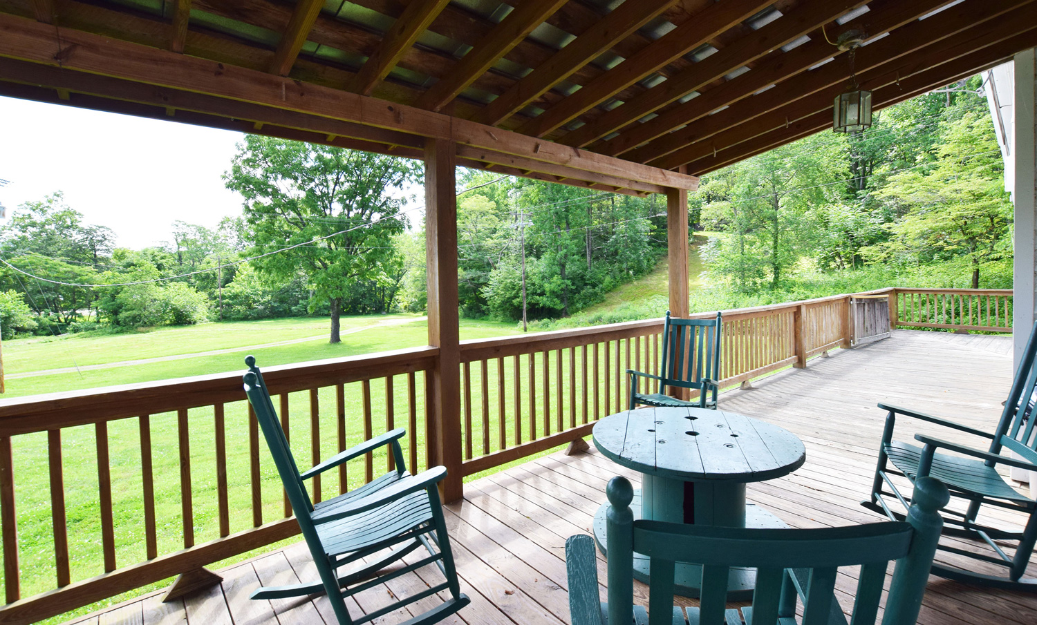 The front of the farmhouse has a three-sided porch with rockers, looking out to Rose River.