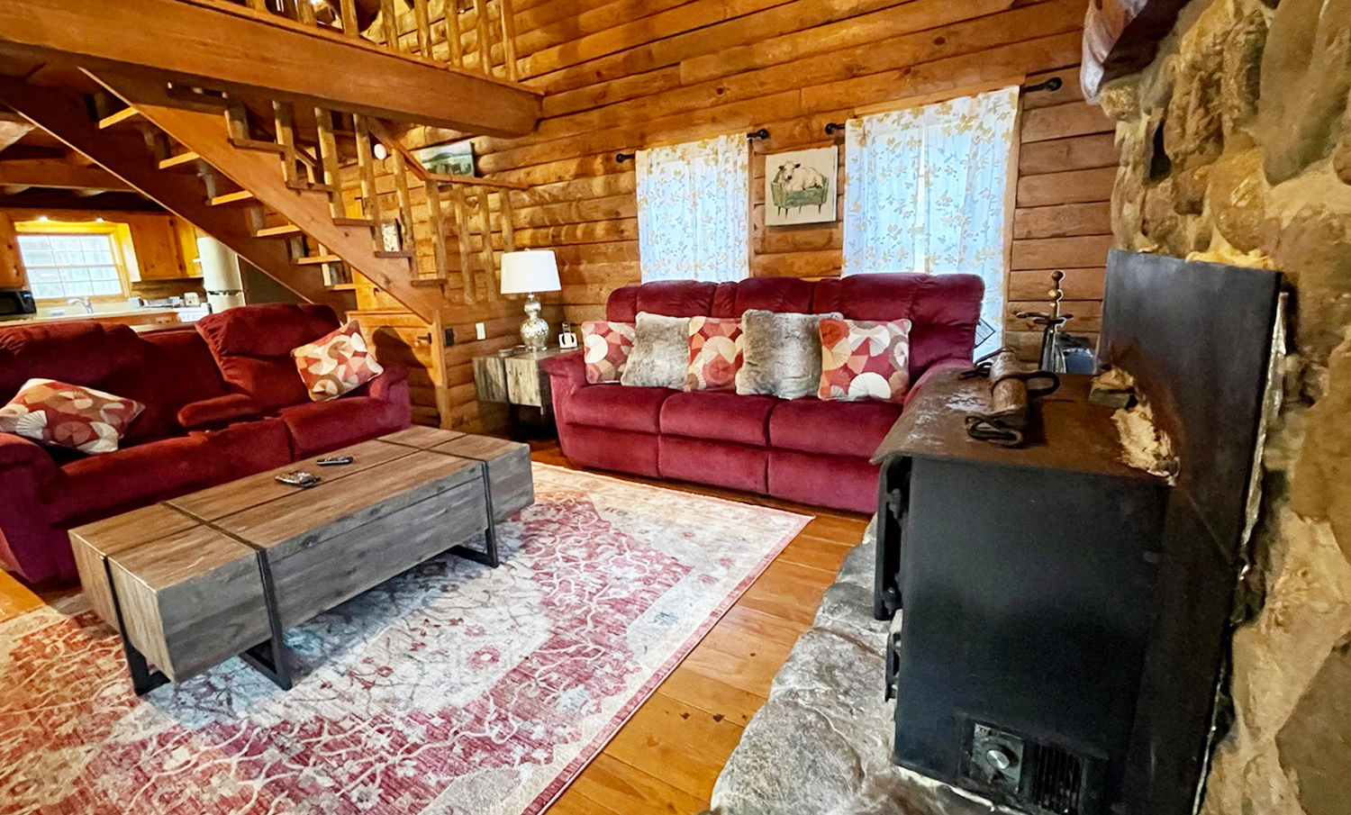 Appalachian style front porch to relax on, large downstairs living space with wood burning stove fireplace, 1 Queen sized pull-out sleeper sofa, 1 Twin sized pull-out lounge chair, cathedral ceiling above, full kitchen, dining table, full bathroom. Upstairs to loft bedroom with 1 Queen.