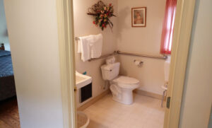 There is one ground floor bedroom with 1 queen and adjacent bath. For guests needing easy access, this bedroom and ground floor can be accessed by a ramp to the back porch, to which you can drive.