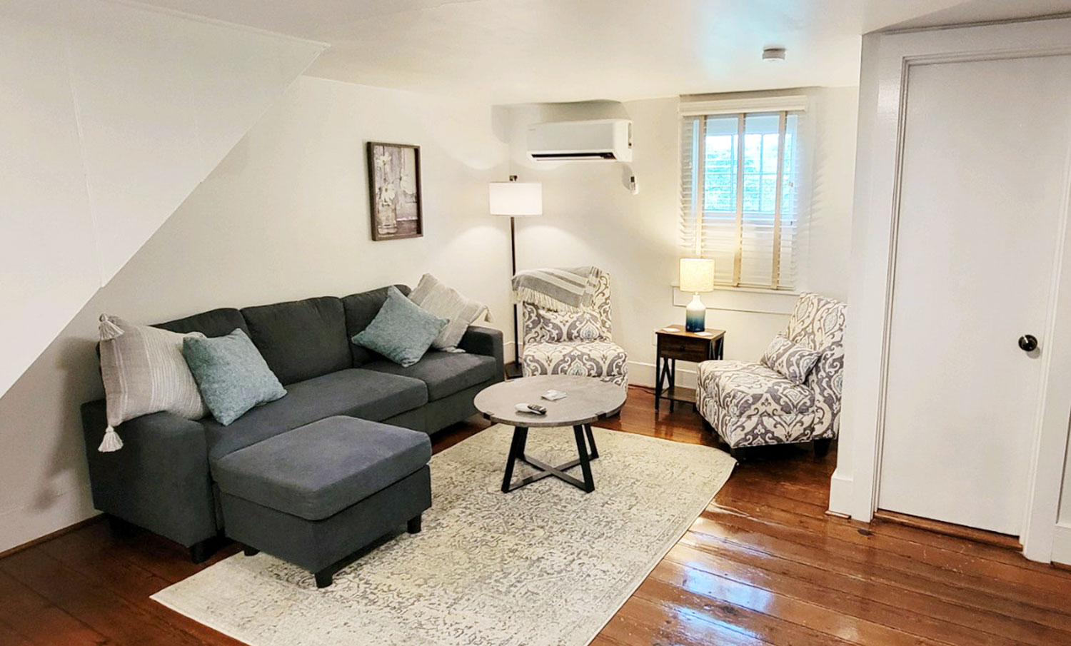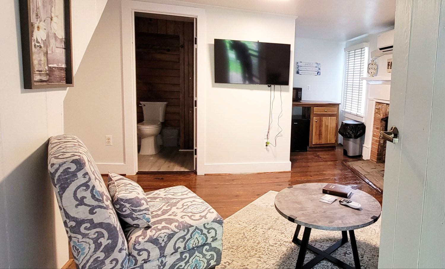 Fully Renovated Suite: Downstairs includes a sitting room with a large historic NON-WORKING fireplace; 1 King Bedroom with Full Bath (shower). Upstairs - one bedroom with 1 Queen bed and 1 Twin bed, half bath. Big shared front porch with rocking chairs.