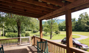 • Shared front porch looking up hill to the Main Lodge, pool to the side