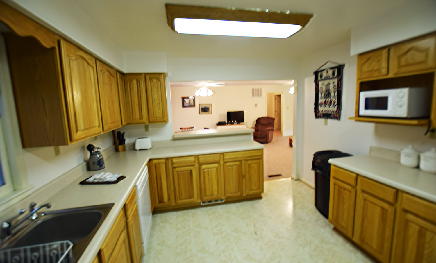 Large living room with fireplace (gas logs for winter warmer), dining table that can extend to 10 places - flowing into full granite topped kitchen with stools and bar. Half bath and laundry room.