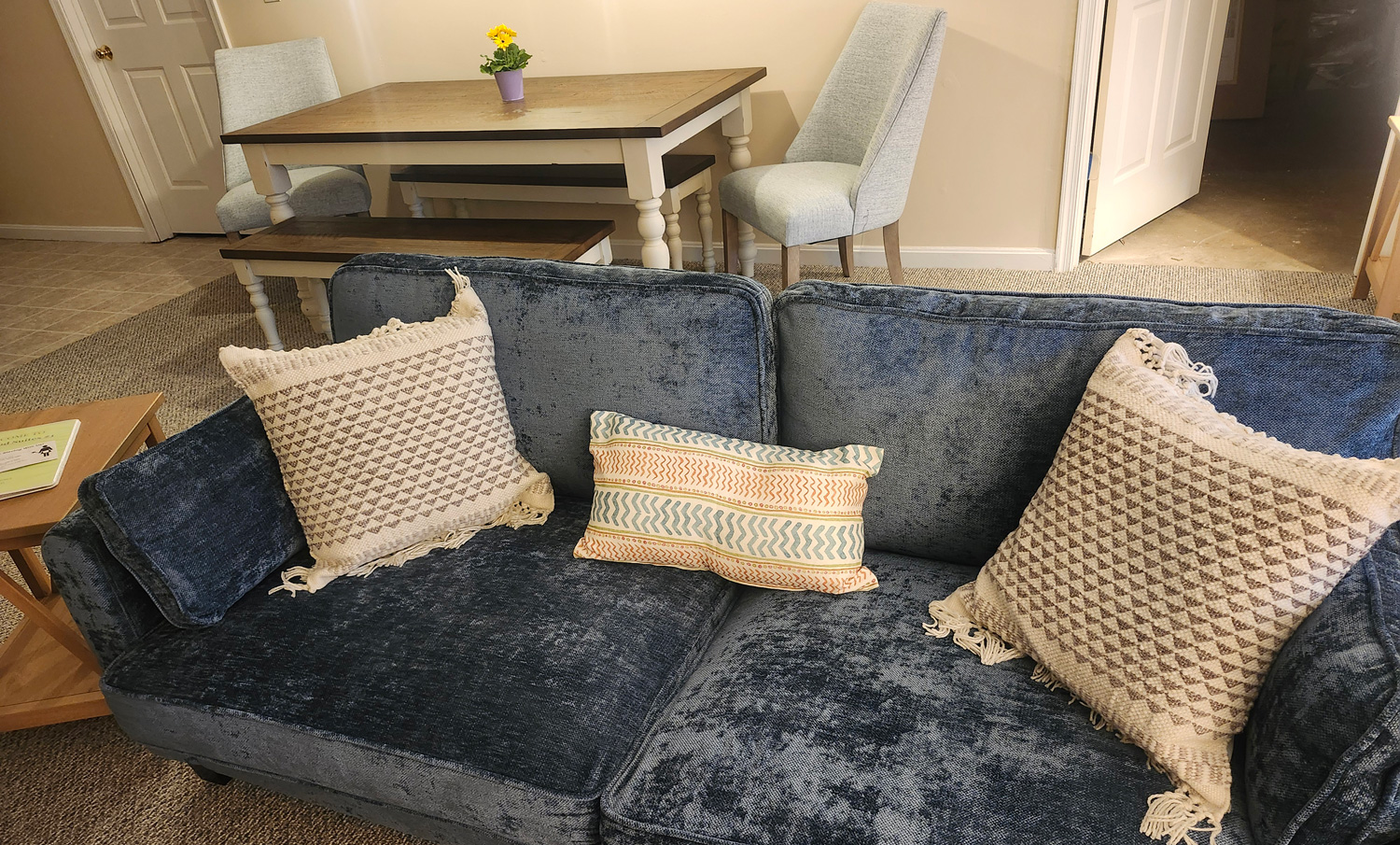 Kite House is large - sleeping 11 in 5 bedrooms. It has a full kitchen and lots of space to gather round the dining table.